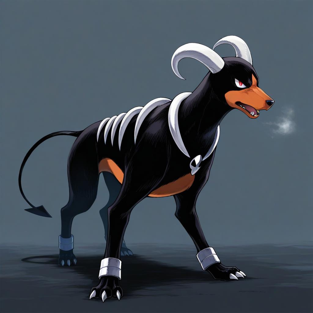 Houndoom, pokemon, no humans, horns, red eyes, black hair, pokemon (creature), claws, by artist tadano kagekichi, illustrious