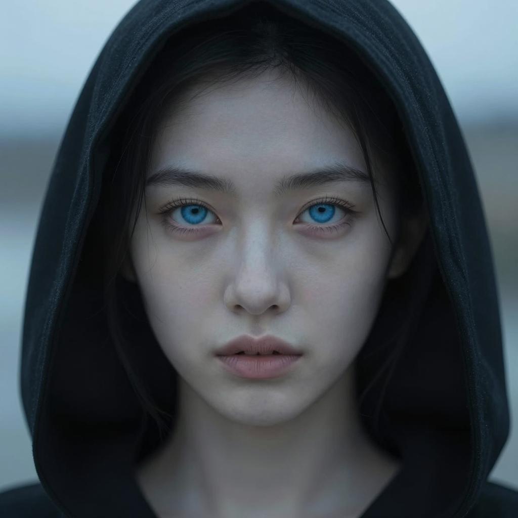 Woman with platinum blonde hair, wearing a dark blue hooded cloak, intense dark eye makeup, and bright red lipstick. Blurred nighttime background with car lights. She looks directly at the camera with a slightly tilted head.