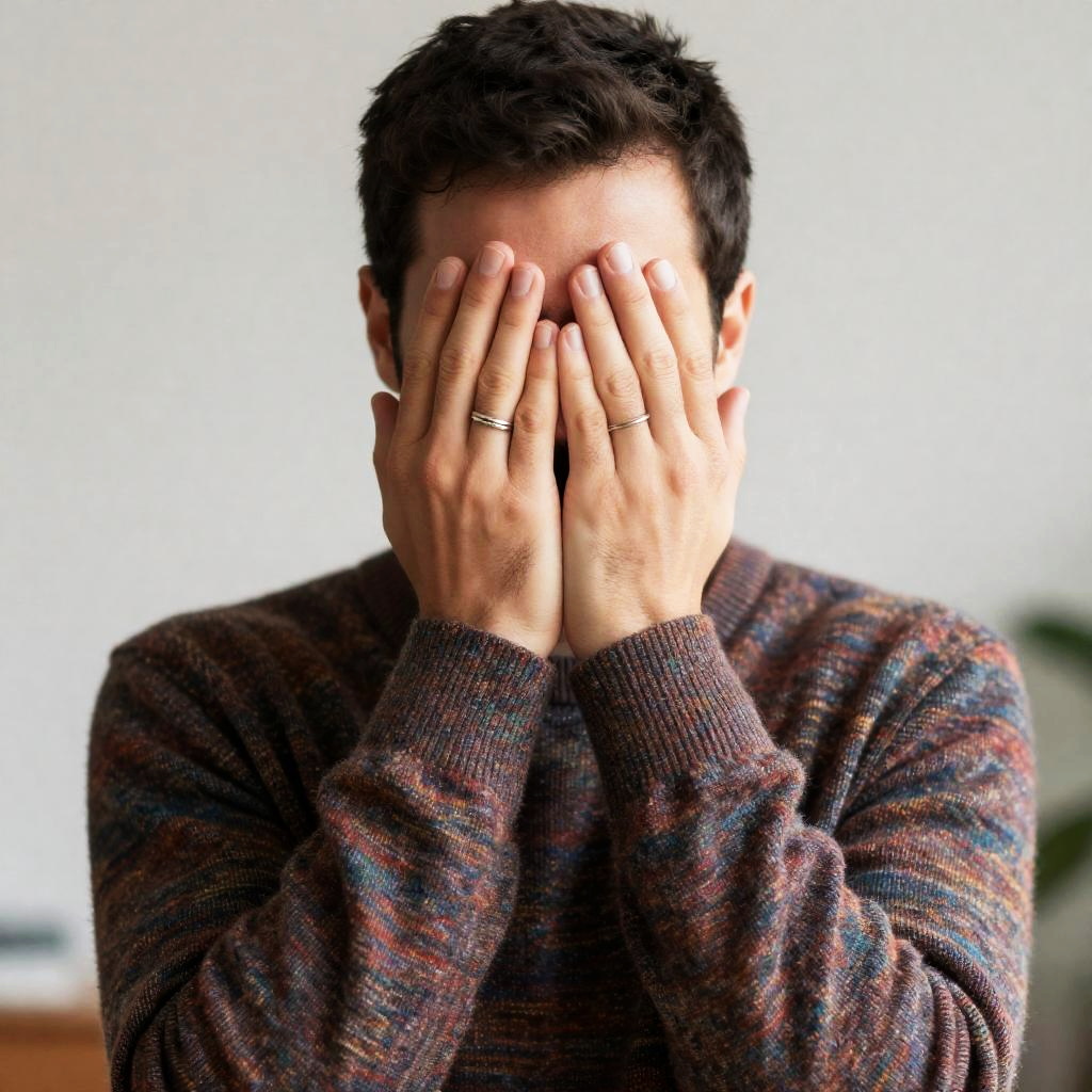 A photograph of a man with short, messy brown hair, wearing a gray suit and white shirt, sitting on a concrete path. He is biting his knuckle with a focused, intense expression. The background includes a canal with reflections, a brick wall, and an industrial metal structure. The scene is dimly lit with a blue-gray hue. The man is in the foreground, slightly to the right.