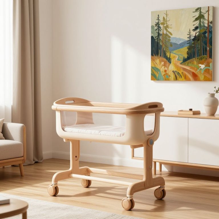 Snoo advanced baby bassinet in a warm family room, blending biophilic design elements with high-tech features, natural wood accents mixed with clean white surfaces, soft daylight filtering in, digital painting with rich color depth