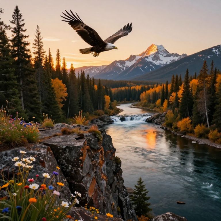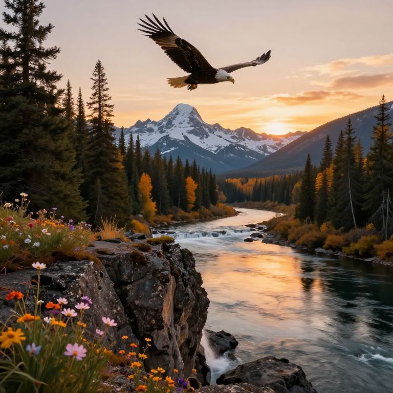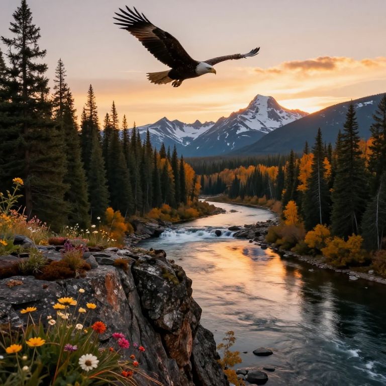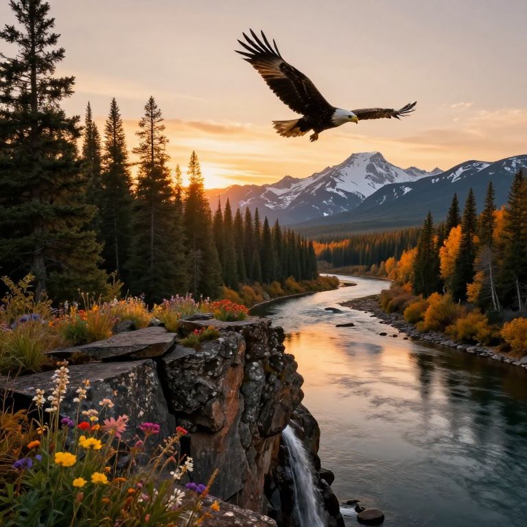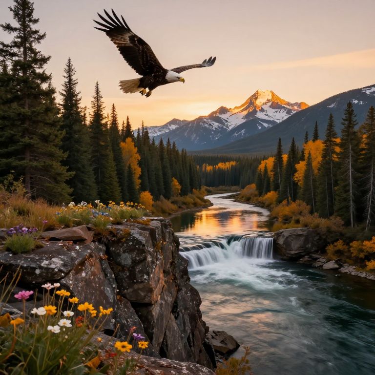 In the warm light of sunset, a majestic eagle soars overhead as the American wilderness unfolds before us, A rugged rocky outcrop, adorned with vibrant wildflowers, overlooks the serene river winding through the valley below, The forest's towering trees, their leaves tinged with autumn's warm hues, stretch towards the sky, A cascading waterfall feeds into the river, its gentle melody a symphony of nature, In the background, snow-capped peaks rise majestically, bathed in the golden light of sunset, their mirrored reflections rippling across the tranquil waters, The rocky outcrop's rough texture is juxtaposed with the delicate petals of the wildflowers, while the forest's intricate foliage and the eagle's soft plumage contrast with the river's smooth surface, The warm lighting casts a soft glow on the landscape, inviting contemplation and awe, Every element contributes to a harmonious composition that celebrates the grandeur and tranquility of this vast, untamed wilderness