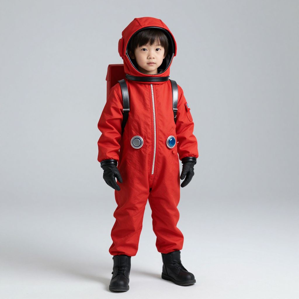 Red Astronaut Costume, child in a red space suit standing on a white surface