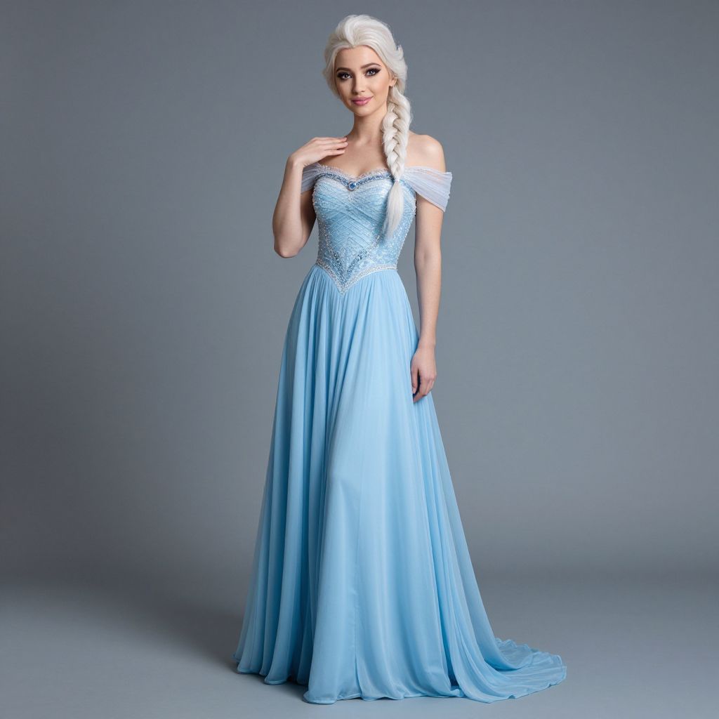 Photograph of a young woman with fair skin and platinum blonde hair styled in a long braid. She is wearing an off-shoulder, floor-length, light blue gown with intricate lace detailing on the bodice and a flowing, pleated skirt. The gown has a subtle sparkle, reminiscent of Elsa's dress from Frozen. She stands against a solid gray background, gazing at the camera with a gentle smile. Her right hand rests on her chest, while her left hand hangs by her side. The lighting is soft, highlighting the dress's delicate texture and her elegant pose.