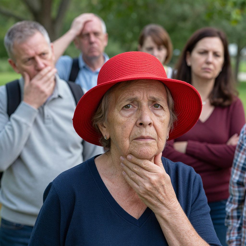 Photograph of an elderly white woman with wrinkles and short gray hair, wearing a bright red, wide-brimmed hat and a light gray shirt. She stands in the foreground with a serious expression. In the blurred background, four people of various ages and ethnicities stand, including a white man in a blue shirt, a white man with dark hair in a gray shirt, a Latina woman with long black hair in a teal shirt, and another white woman with brown hair in a pink shirt. The setting is outdoors with green trees visible. The image has a shallow depth of field, focusing on the woman in the hat.