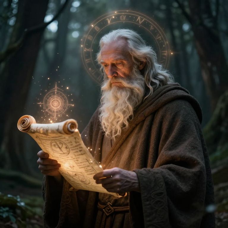 Filosofo depicted as a wise elder with a long beard, holding a glowing scroll, with ethereal light and mystical symbols surrounding him, set in a dark mystical forest, combining fantasy elements with symbolic philosophy art.