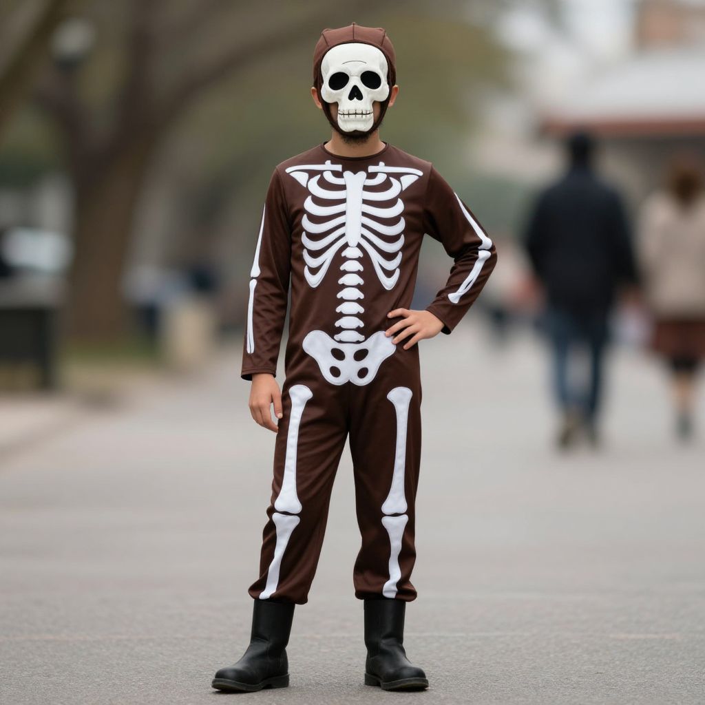 Bone daddy costume, 1boy, male focus, solo, hat, brown headwear, skeleton, standing, full body, boots, blurry background, brown pants, blurry, pants, outdoors, facial hair, hand on own hip, shirt, long sleeves, closed mouth, looking at viewer