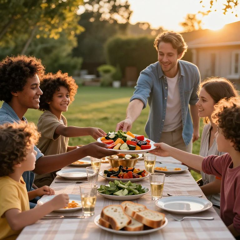 A diverse family gathered around a picnic table in a backyard, passing around a platter of grilled vegetables and fresh bread, with the golden hues of sunset reflecting on their faces.