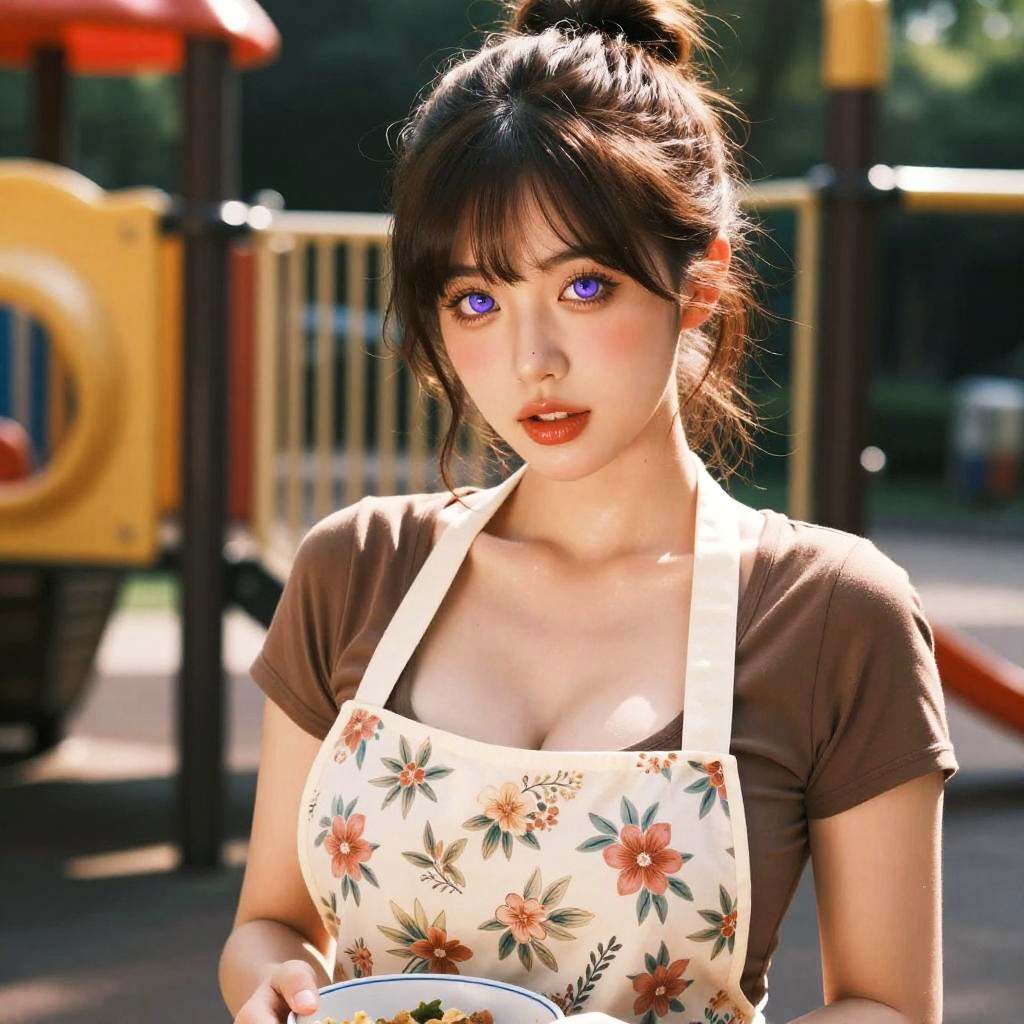 Masterpiece:1.5, best quality:1.5, aesthetic, 1girl, sidelocks, cinematic lighting, sharp focus, large breasts, mature female, horny, 16k, glowing eyes, detailed 4k eyes, playground, seduction, sexy lips, parted lips, detailed lips, high detailed background, ((big purple eyes)), detailed face, shiny skin, auntjunev3, auntjune, hair bun, bangs, messy hair, brown hair, ( brown shirt:1.3), floral print apron, food, brown eyes, bowl, blush, solo focus, full cloths, short sleeves, sligh cleavage