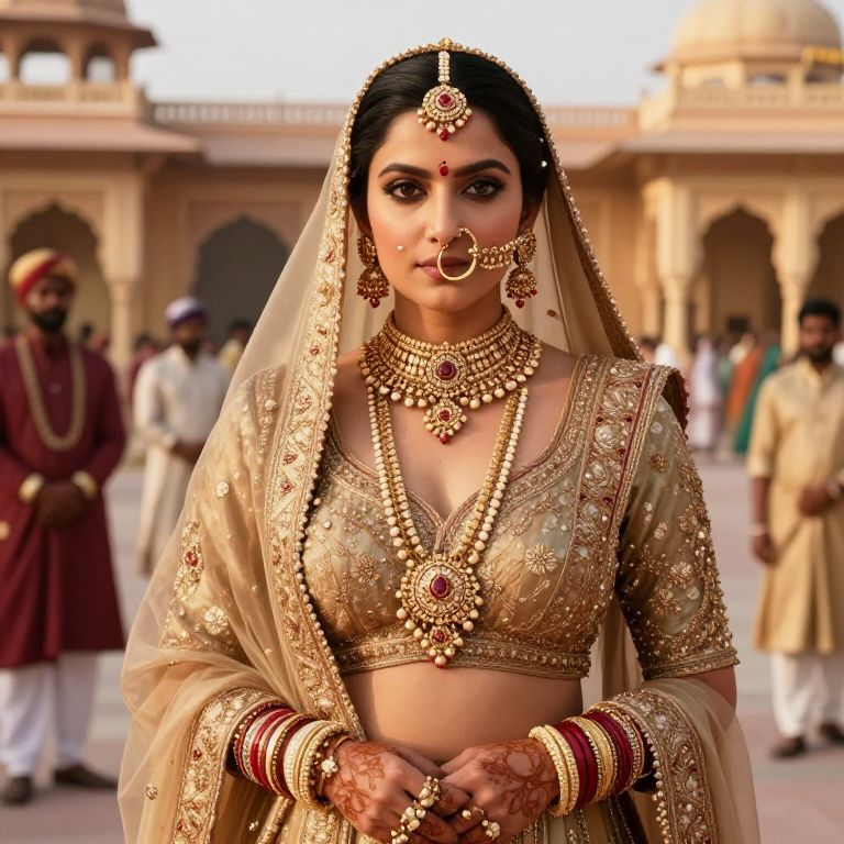 A majestic Indian maharani in her prime, with a regal face featuring high cheekbones, deep brown eyes, and a dignified expression, dressed in richly embroidered silk and gold-threaded fabrics, adorned with intricate traditional gold ornaments including a heavy jhumka, temple nose ring, and a heavy bangles set, standing in a grand palace courtyard during a royal celebration under golden sunlight, surrounded by servants and ornate architecture.