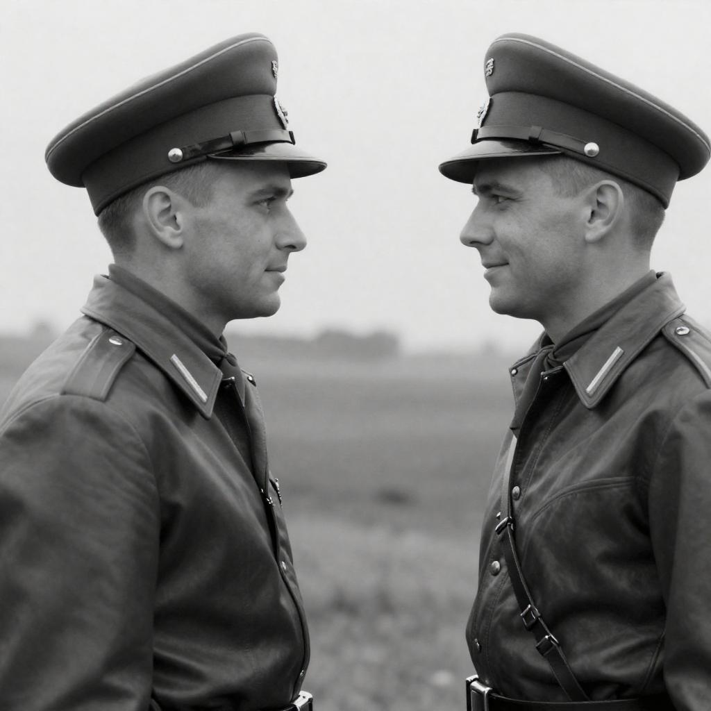 Black-and-white photograph of soldiers pushing a large, wooden artillery wagon. Nine soldiers in military uniforms and hats, some standing, some kneeling. Intense expressions, rugged ures, overcast sky in background. Wheels, metal parts of wagon visible. Mud-covered ground. Soldiers' uniforms dark, slightly worn. Background blurred, no distinct landmarks. Soldiers' postures show effort, coordination.