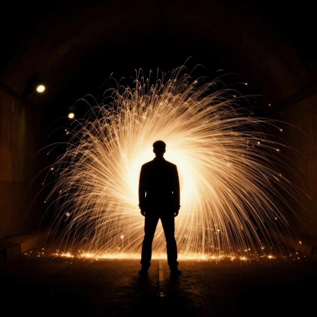 Silhouetted man standing in front of a bright, fiery explosion of sparks, creating a dramatic contrast against the dark night. Photograph.
