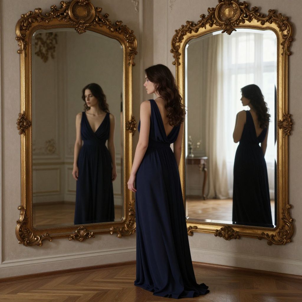 Elegant woman in a flowing navy gown stands between two ornate gold-framed mirrors, her back turned as reflections reveal layered perspectives of a timeless interior, blending light and shadow in a serene, introspective moment.