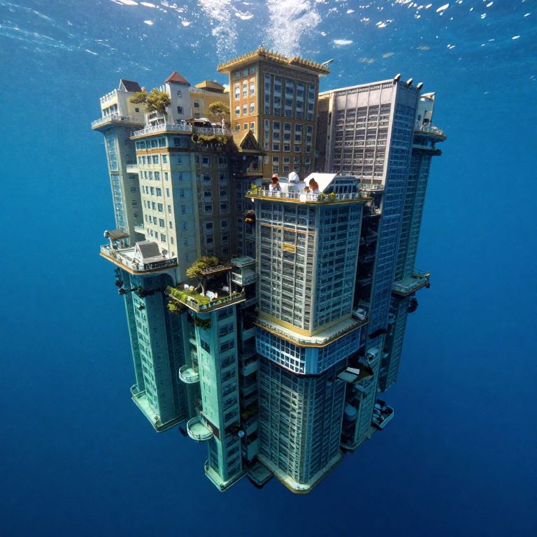 Photograph of an underwater scene featuring a cluster of tall, modern high-rise buildings with varied architectural styles, all standing together in the deep blue sea. The buildings have glass windows, balconies, and rooftop structures illuminated by sunlight filtering from above. The structures are slightly tilted, creating a surreal, floating effect. The background is a clear, expansive blue ocean, with light patterns from the surface visible above. The buildings' materials include glass, concrete, and metal, giving a textured and reflective appearance. The overall scene combines elements of urban architecture with a fantastical underwater environment.