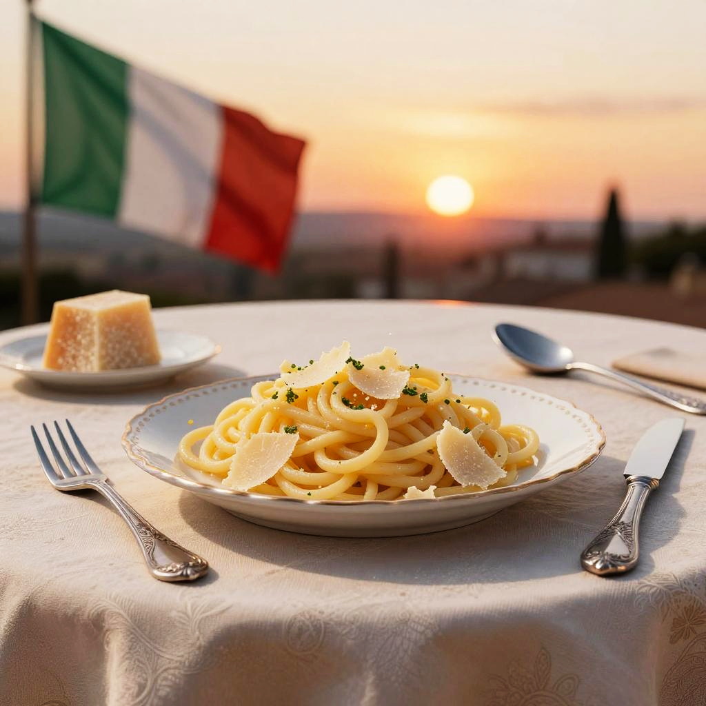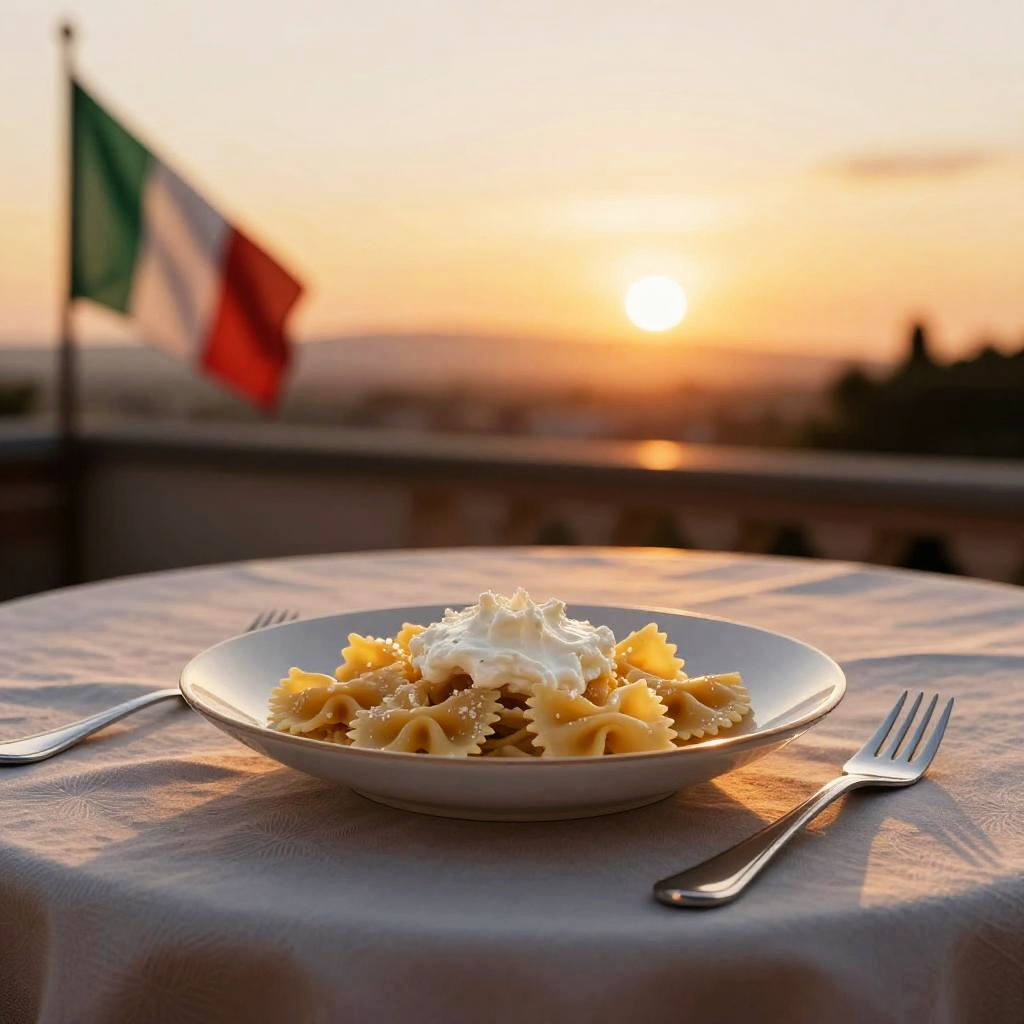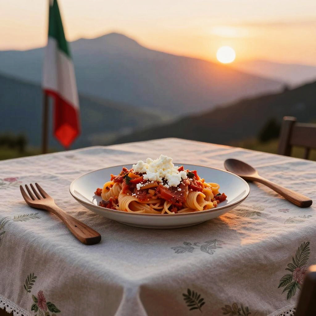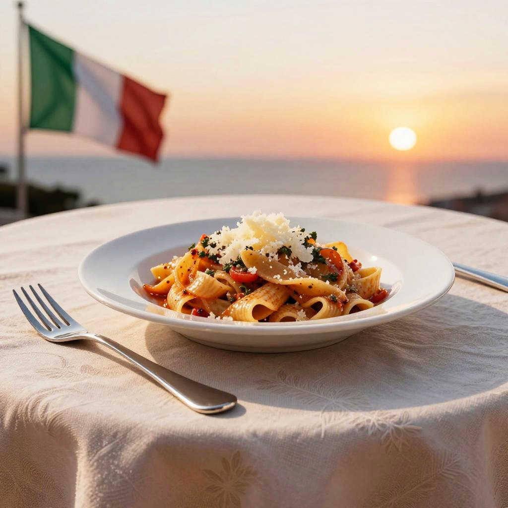 Table with Italian-style tablecloth, blurred sunset background, penne arrabbiata on the dish, grated pecorino sardo cheese, modern brushed steel cutlery, warm sunset lighting, high quality digital art, Italian detailed fabric texture, warm tones, Italian flag in the background, sunset on the horizon