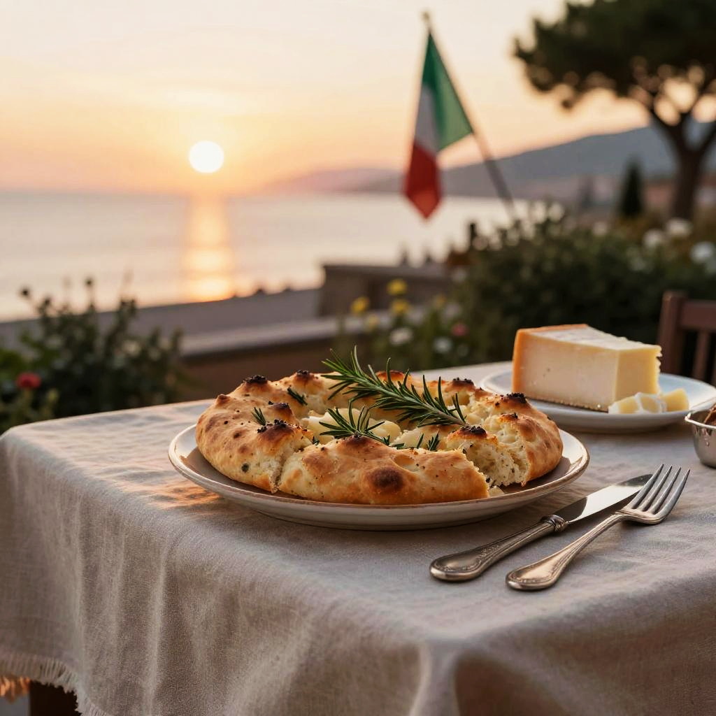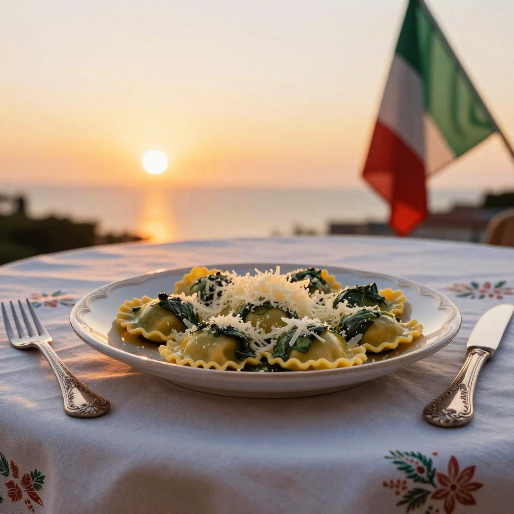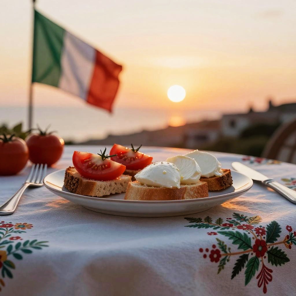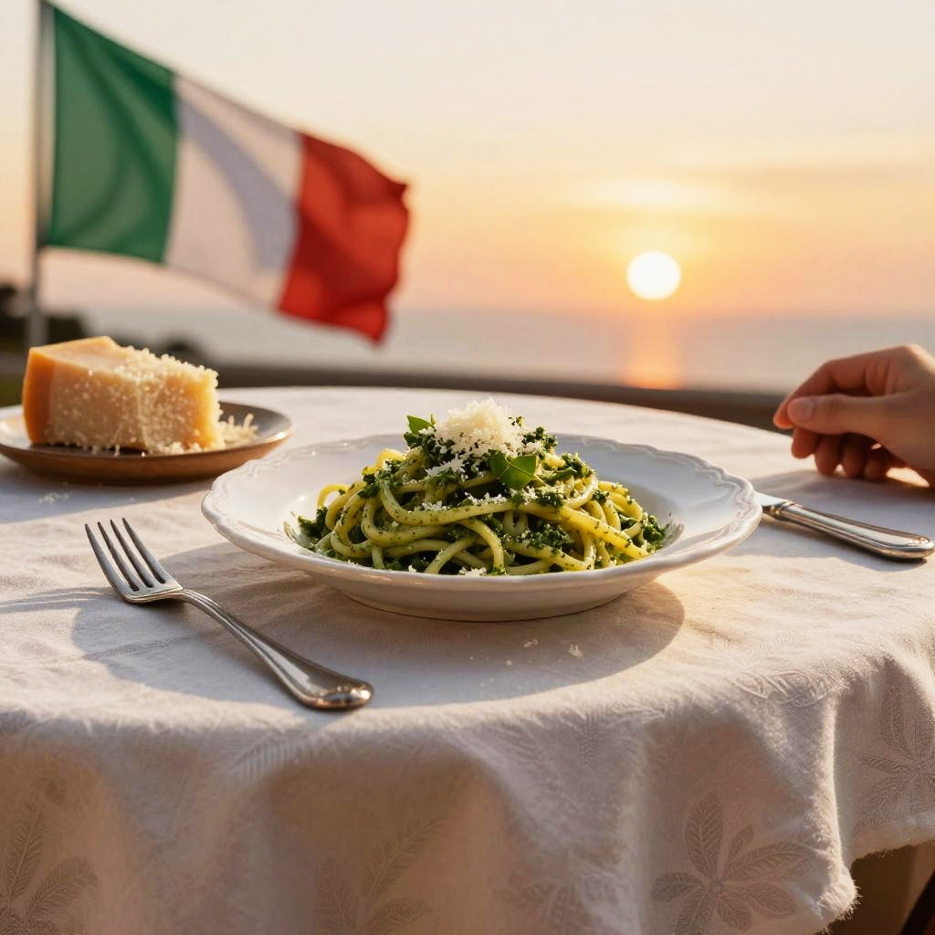 Table with Italian-style tablecloth, blurred sunset background, penne arrabbiata on the dish, grated pecorino sardo cheese, modern brushed steel cutlery, warm sunset lighting, high quality digital art, Italian detailed fabric texture, warm tones, Italian flag in the background, sunset on the horizon