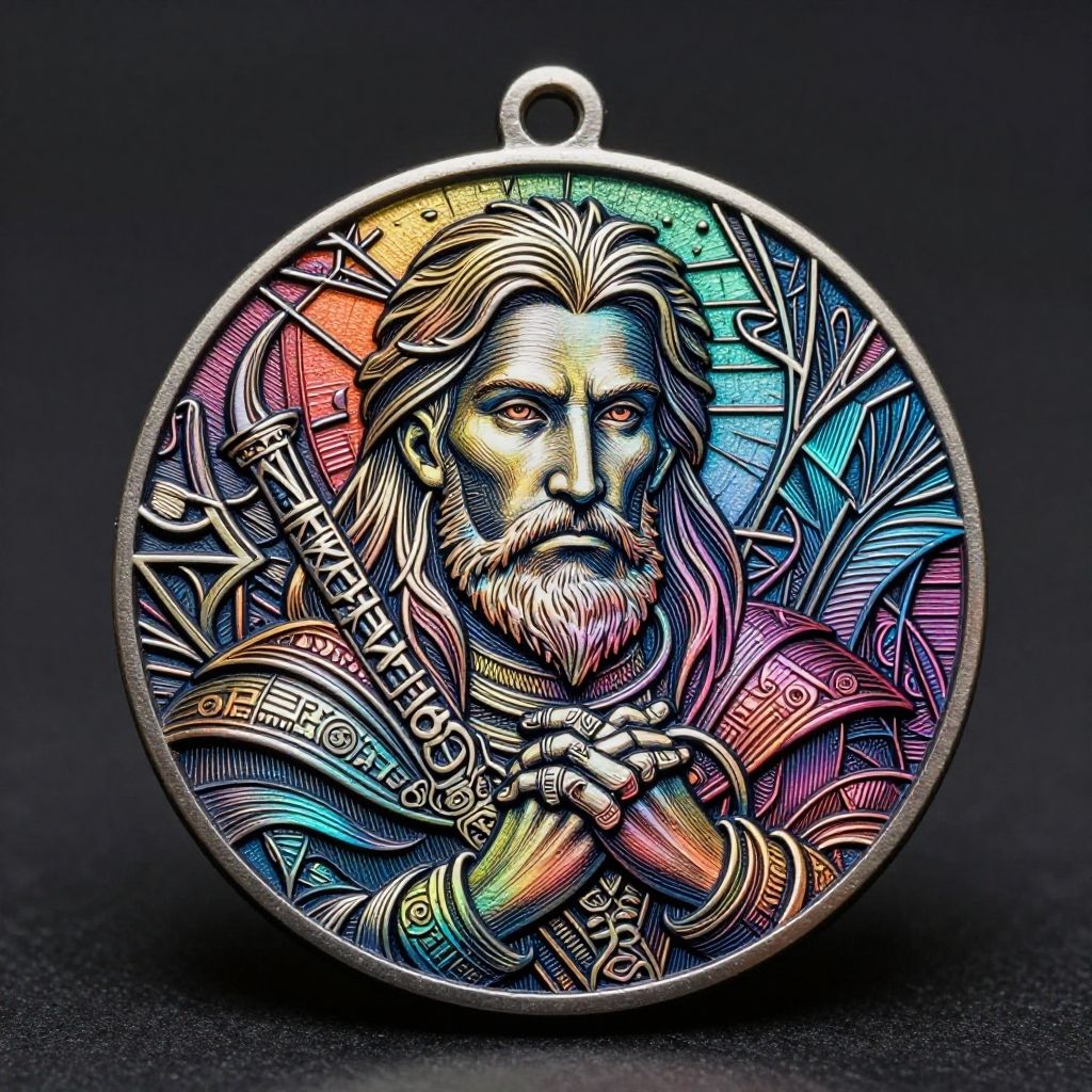 This is a photograph of a highly detailed, circular metal pendant featuring a stylized, bearded man with long hair, reminiscent of Jesus Christ. The pendant is adorned with intricate, colorful patterns and symbols, including crosses and abstract shapes, set against a rainbow gradient background. The man's expression is solemn, and he holds his hands together in front of him. The pendant's texture is raised, with precise, engraved lines creating a sense of depth and dimension. The metal is shiny, reflecting light, and the overall style is a blend of medieval and modern artistic elements. The background is a solid, dark gradient, highlighting the pendant's vibrant colors and intricate design.