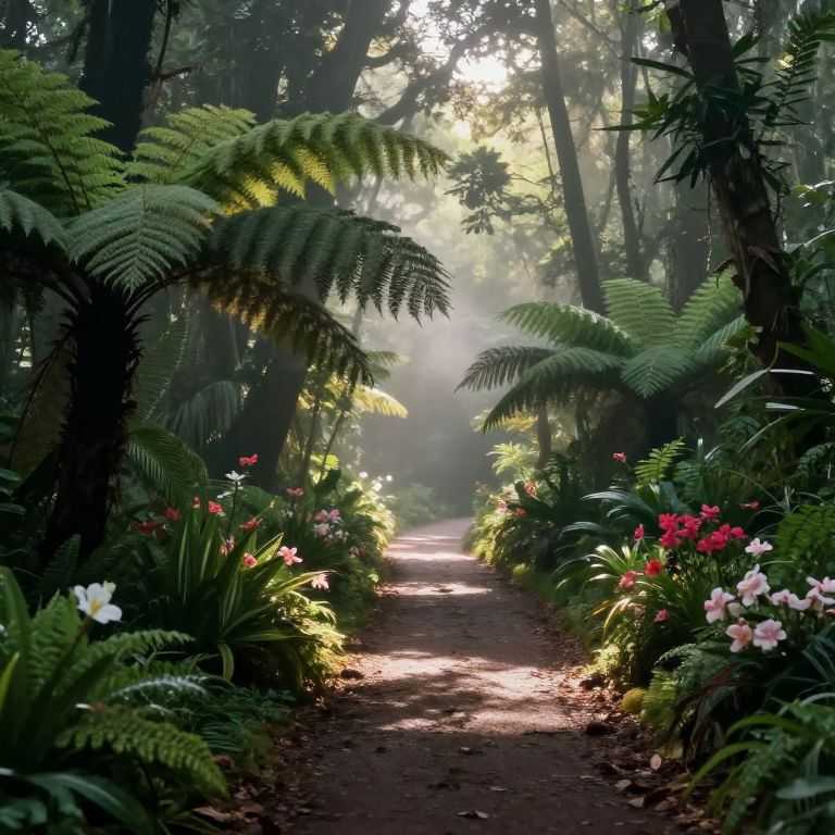 Koa forest pathway, sunlight dappling through dense canopy, tropical ferns and blossoming flowers lining the path, mist rising in early morning, enchanted and tranquil environment, cinematic detailed landscape