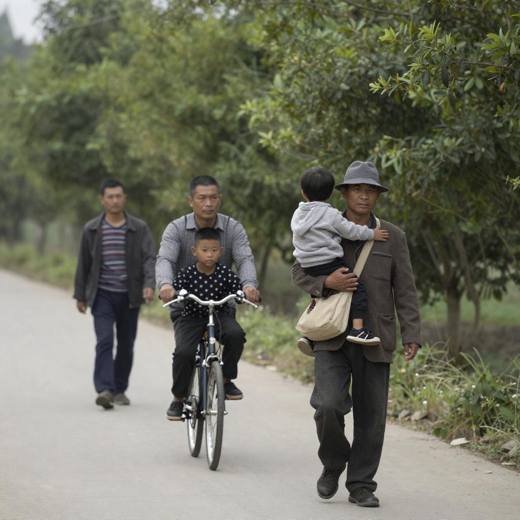 Photograph of an Asian woman with black hair in a plaid shirt and orange pants, carrying a baby and a large yellow bag, walking on a busy urban street. A young boy with black hair, green pants, and a white shirt walks beside her, holding a blue bag. Other pedestrians and buildings in the background.