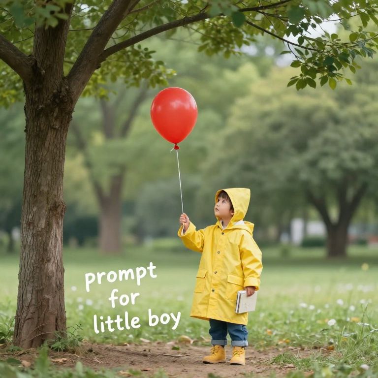 A curious little boy in a yellow raincoat stands under a tree in a park, holding a red balloon that floats gently in the breeze, a small book in his hand, the keyword 'prompt for little boy' appearing as text in a friendly, hand-written font on the ground nearby, whimsical and imaginative atmosphere.