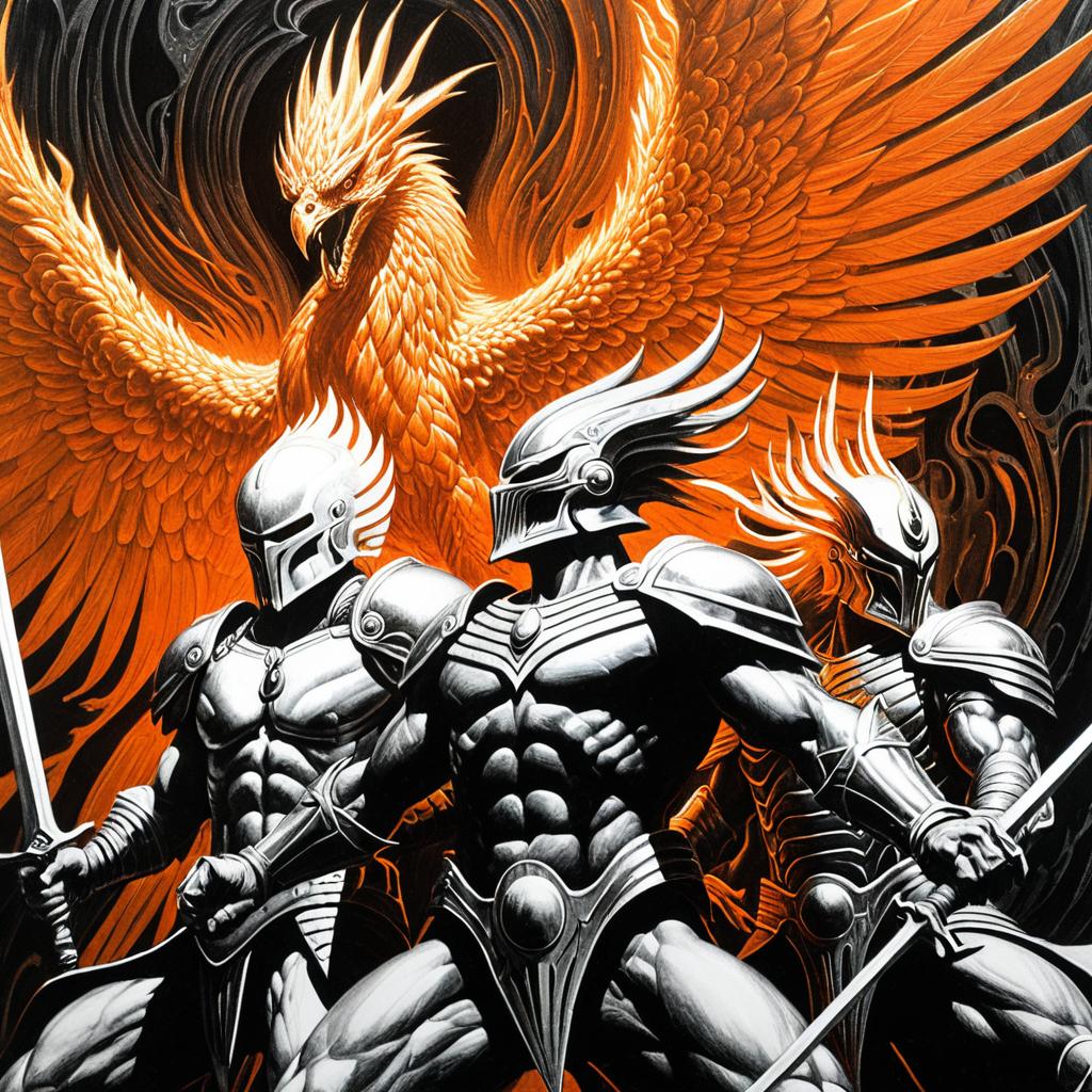 Op Art Fine Line illustration with graphite pencil with a wash of iridescent oil, eternal phoenix warriors of immense power engaged in combat, Mixed styles of Frank Frazetta, H. R. Giger, Alex Ross, hyper realism, thick textured fiery orange white gold ancient patterns, depth, extraordinary, vibrant, cinematic raking light, subsurface scattering, chromatic aberration