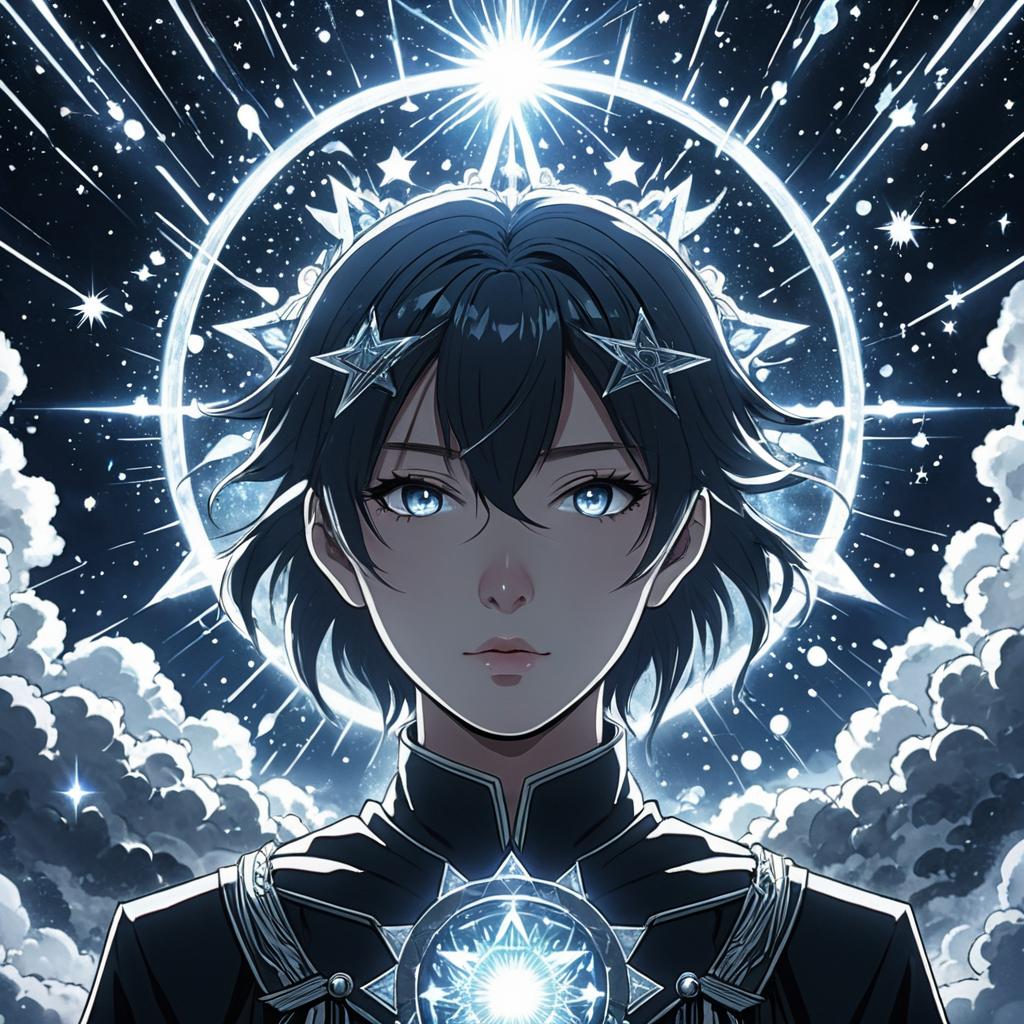 An ethereal oracle, with radiant halo, eyes like liquid silver, surrounded by glowing star fragments floating around, in a celestial temple floating among clouds, depicted in the sleek and dynamic anime style of Tite Kubo.