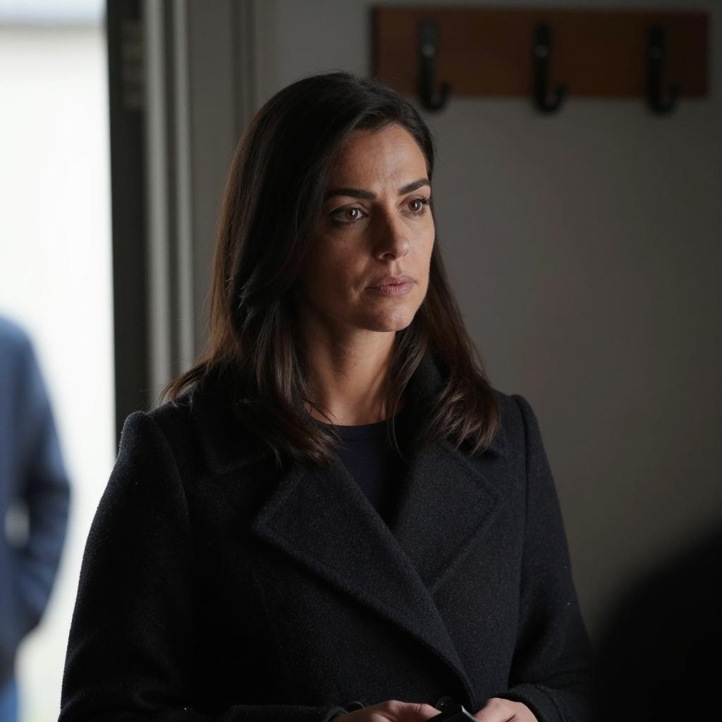 A woman with medium-length dark brown hair, wearing a dark coat, standing indoors. She has a focused expression and is looking slightly to the right. A dark object is in her hands. Background shows a dimly lit doorway with metal hooks. Light from outside illuminates part of her face.