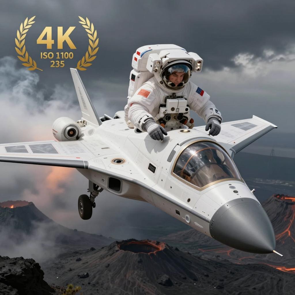 Male astronaut piloting a futuristic jet through stormy volcanic landscape, fashion photography, glam art, cinematic drama, epic scale, exquisite detail, 30-megapixel 4K, 85 mm lens, sharp focus, f/8, ISO 100, 1/125 s shutter, diffuse back-lighting, award-winning composition.