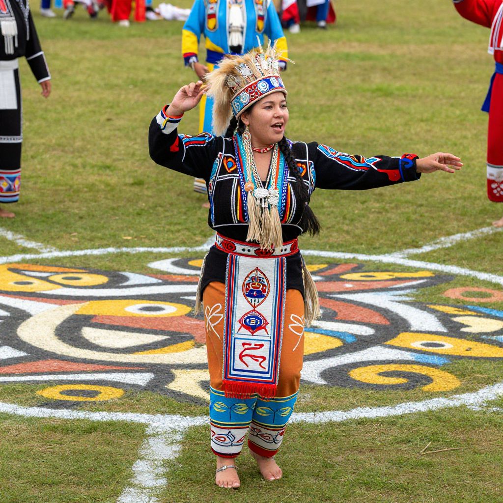 Photograph of an Indigenous woman in traditional attire, standing on a grassy field with colorful painted patterns on the ground. She wears a black, long-sleeve dress adorned with red, blue, and white patterns, orange leggings with blue and white designs, and a white headpiece with feathers. Her long blonde hair is partly covered by the headpiece. She holds her right hand to her head and her left arm out to the side, smiling. Other people in similar traditional clothing are visible in the background, with some wearing red and blue. The grass is green and the painted patterns are vibrant.