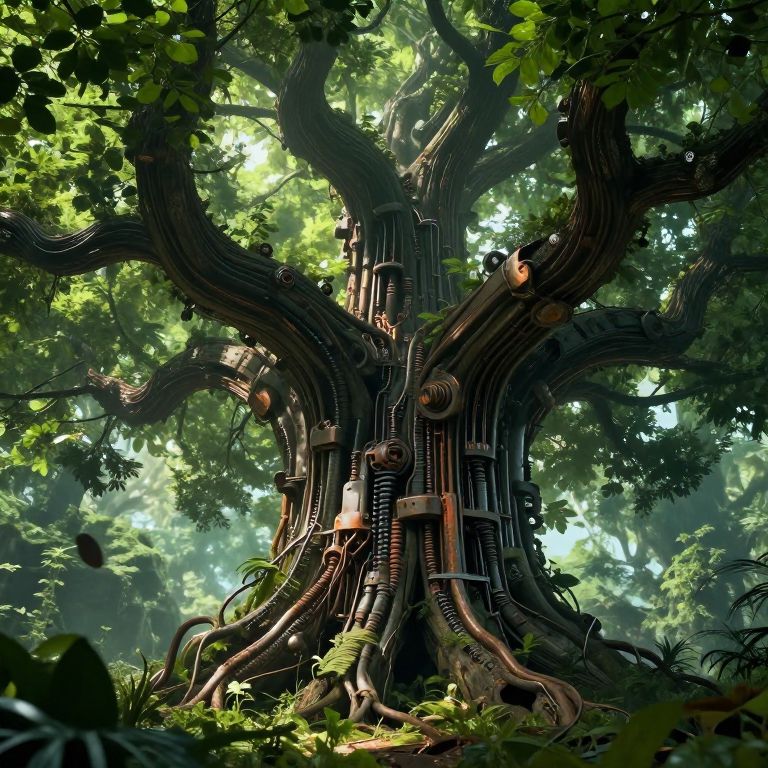 Digital artwork of a massive, ancient tree with tangled, mechanical roots and vines in a lush, sunlit forest, blending nature and technology.