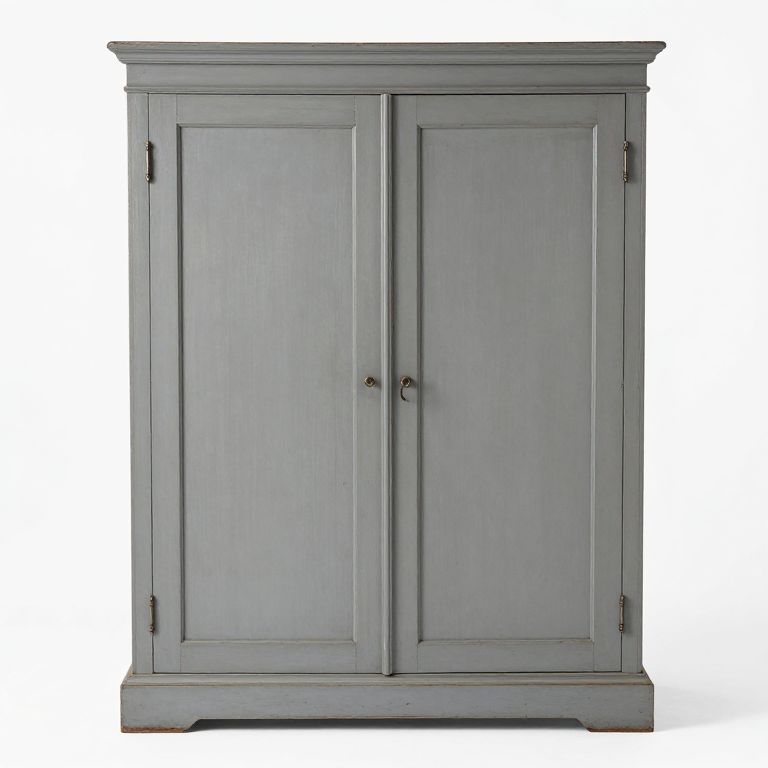 Photograph of a tall, rectangular, vintage-style cabinet with a gray finish. The cabinet features two symmetrical doors with simple, rectangular panels, each with a small, round, black metal handle in the center. The doors are slightly recessed with thin, black metal hinges on the upper left and lower right corners. The cabinet has a flat top and a slightly raised base, both matching the gray color. The texture of the cabinet is smooth with a subtle, matte finish, and the overall style is classic and understated, suitable for traditional or rustic decor.