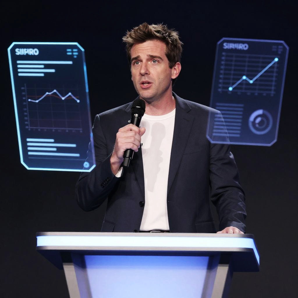 AI generated image of Ben Shapiro speaking at a debate stage, dramatic lighting, digital art style with holographic interface elements, futuristic and slightly surreal atmosphere