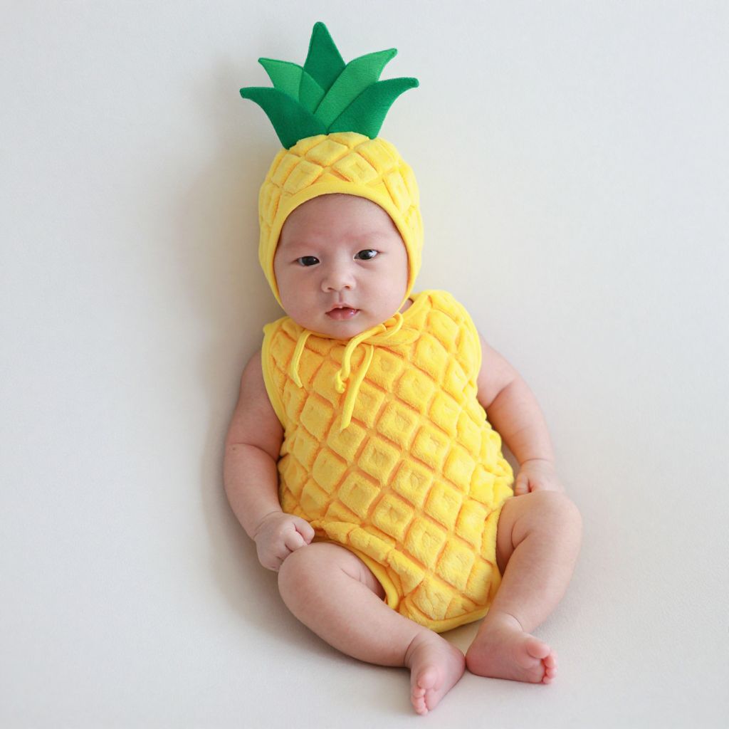 Photograph of a baby wearing a yellow pineapple onesie with a green leaf hat, sitting against a white background.