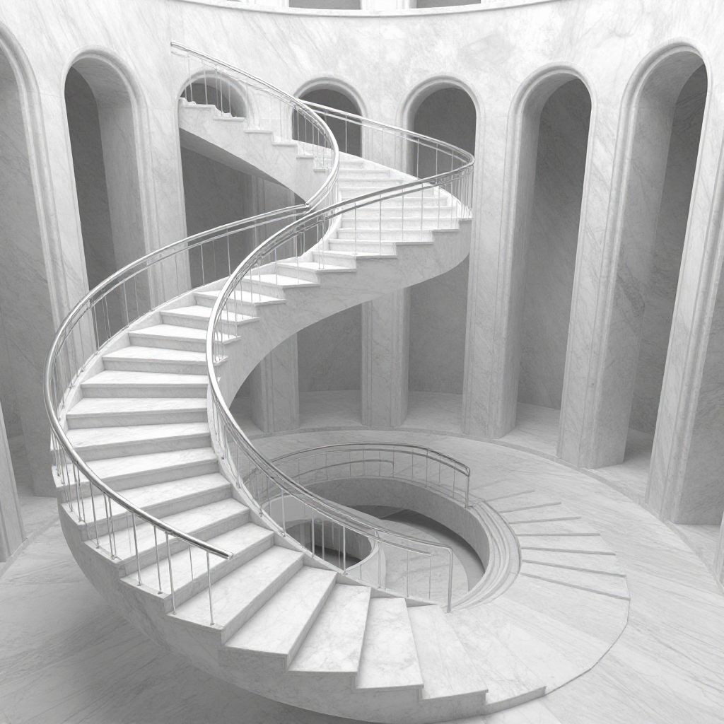 A computer-generated 3D render depicts a marble staircase spiraling elegantly upward, its curves and arches creating an illusion of endless ascent, evoking a timeless, ageless journey through a serene, high-definition architectural space.