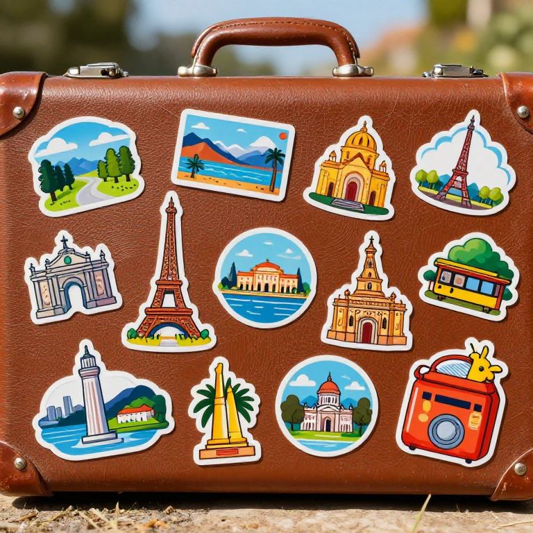 Sticker pics illustrating a vibrant mix of travel-themed stickers on a vintage suitcase, capturing scenic landmarks, cultural icons, and adventure motifs with sunlit outdoor environment and warm summery tones.