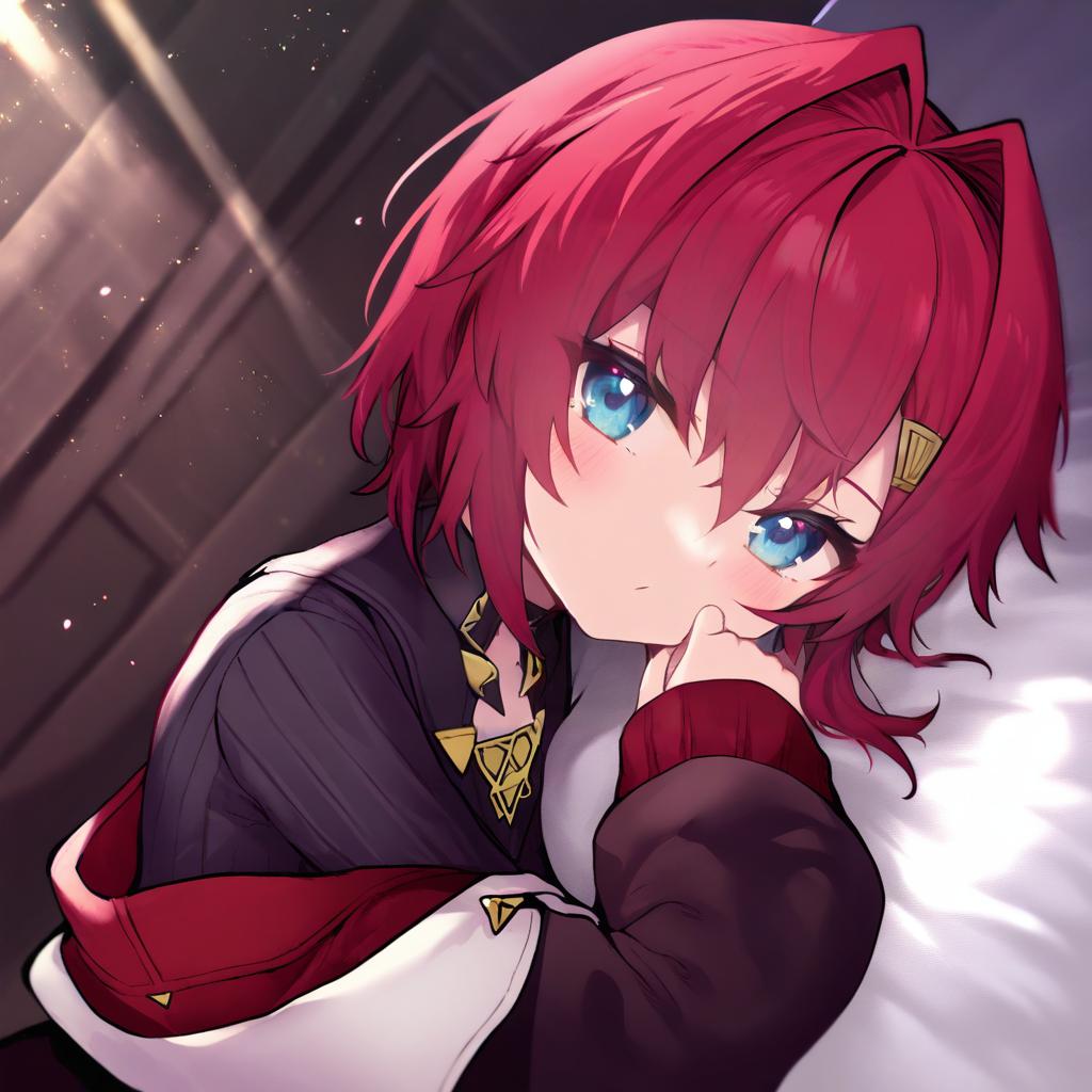 Close-up digital artwork of a female anime character with short red hair and striking blue eyes. She wears an off-shoulder, long-sleeve outfit with distinct dark and red colors, featuring gold triangle decorations and a hairclip on the side. The character has a delicate, soft expression and is resting her chin on her hand. The background is softly blurred with warm light effects.