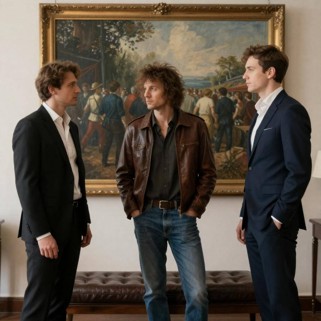 Photograph of three men in a room with a large, framed painting of a bustling scene in the background. The man on the left wears a black suit and white shirt, the man in the center has shaggy hair, a brown leather jacket, and blue jeans, and the man on the right wears a dark blue suit. They stand near a tufted brown leather bench.