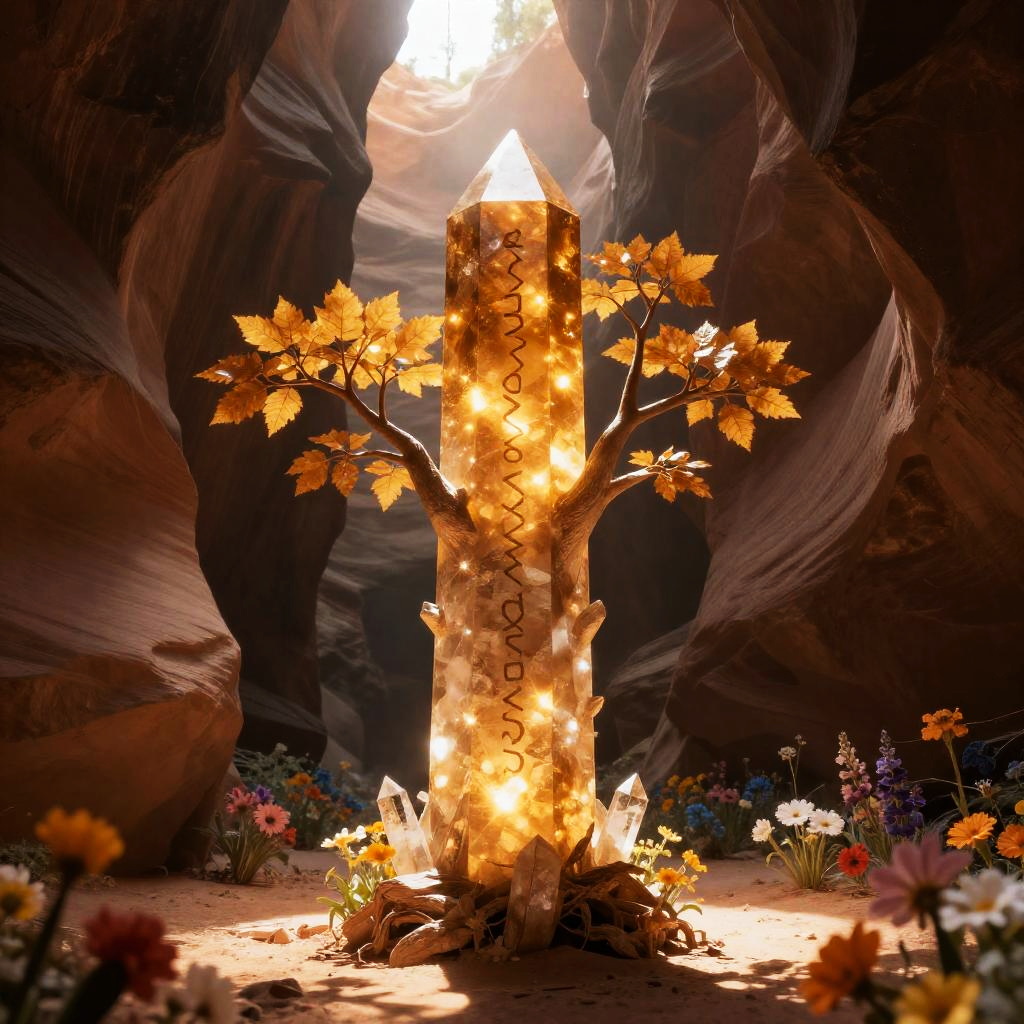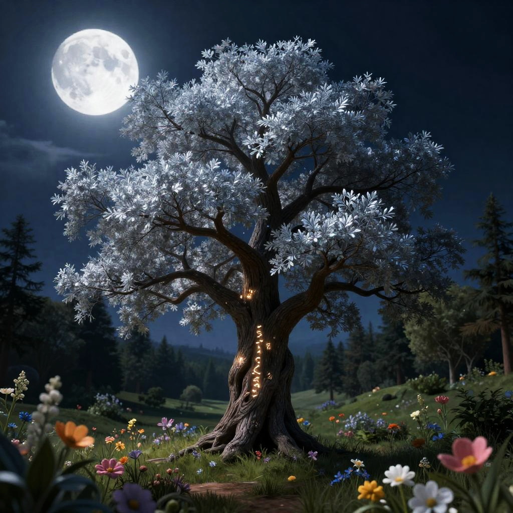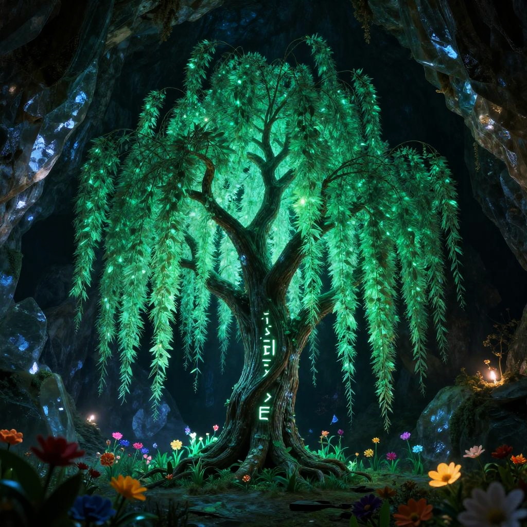 A radiant willow stands in the center of a twilight forest, its leaves made of shimmering amber glow. The tree’s trunk is adorned with carved runes that pulse softly, while flowers of every color bloom eternally around its base.