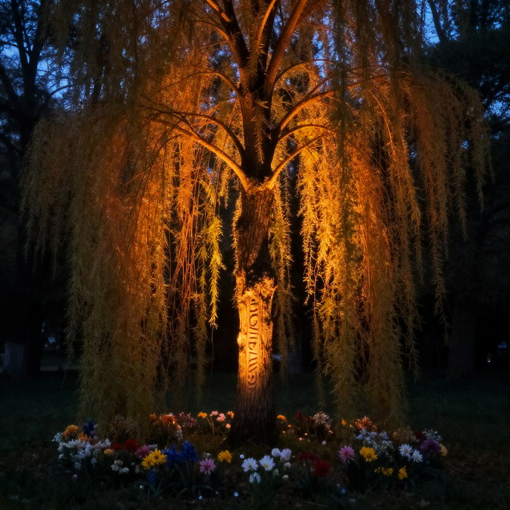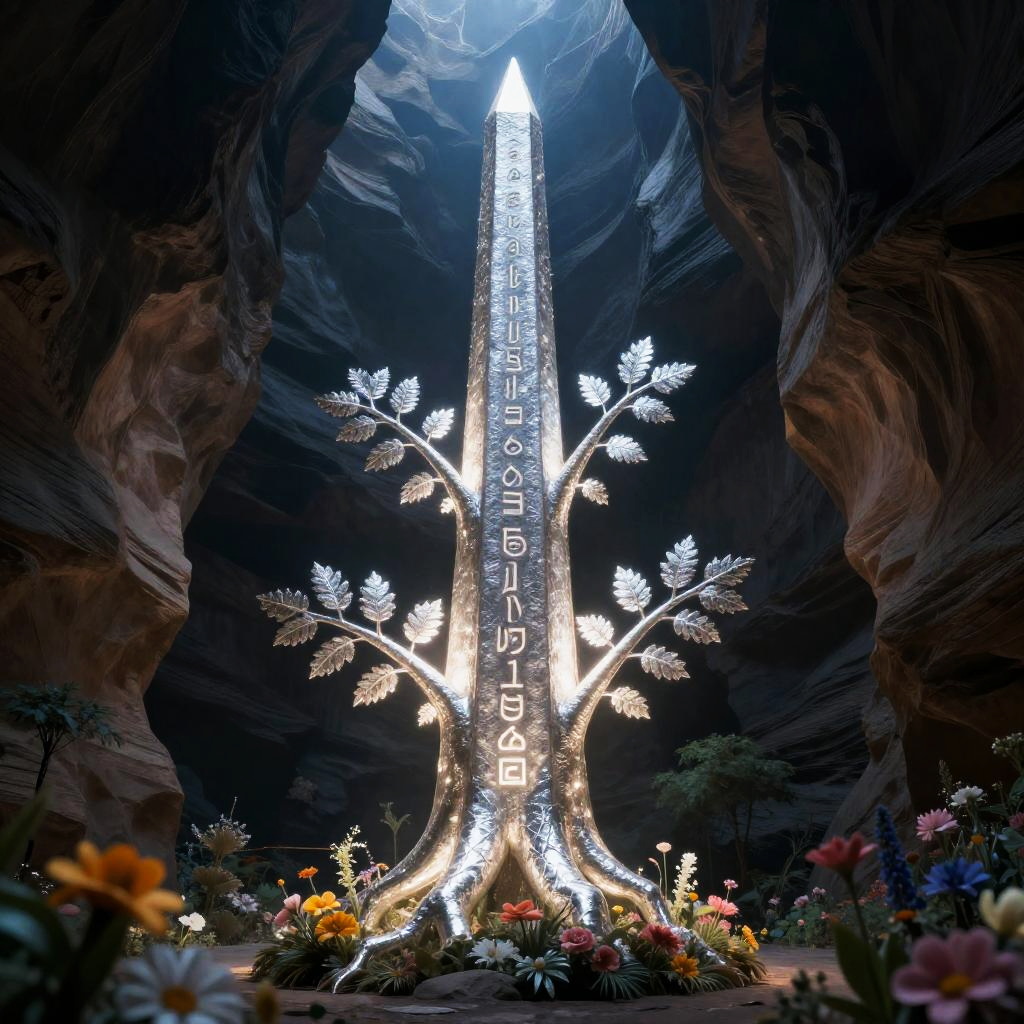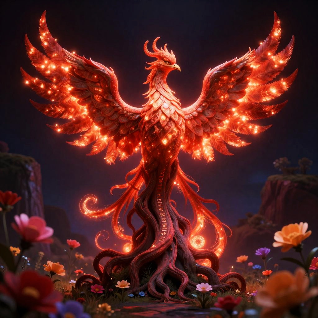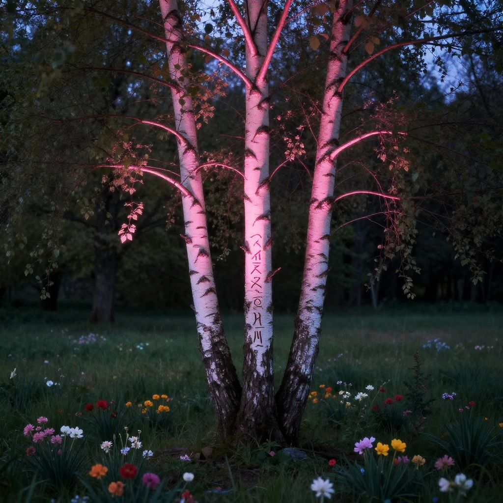 A radiant willow stands in the center of a twilight forest, its leaves made of shimmering amber glow. The tree’s trunk is adorned with carved runes that pulse softly, while flowers of every color bloom eternally around its base.