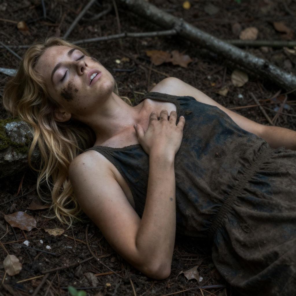 Photograph of a woman with dirty, disheveled brown hair, wearing a tattered brown dress, crawling on all fours in a dark, grassy field. Her face is illuminated by a bright, fiery orange background. The image has a dramatic, intense atmosphere.