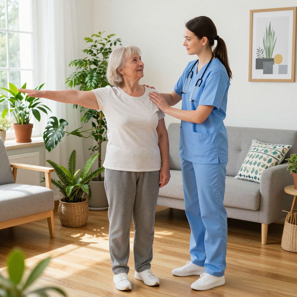 A homecare nurse helping a senior woman with daily exercises in a sunlit room filled with plants, wooden flooring and comfortable furniture, scene focused on wellbeing and active aging, vibrant natural colors, hyper-realistic detail.
