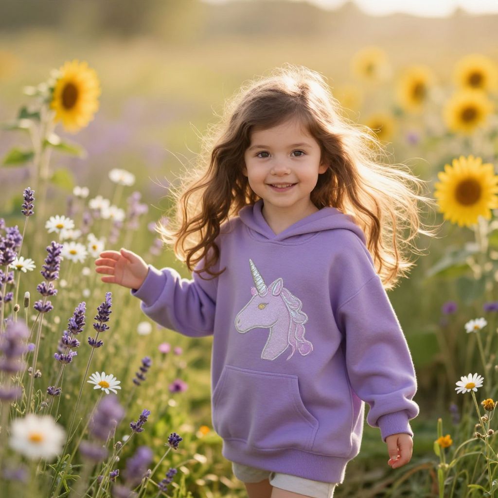 A young girl with long, flowing brown hair that falls softly around her shoulders, naturally wavy and sun-kissed, wearing a cozy, slightly oversized purple hoodie with a delicate, shimmering unicorn horn embroidered in soft silver thread on the front, standing in a sunny meadow bursting with vibrant blooming flowers—daisies, lavender, and golden sunflowers—her eyes sparkling with joy and curiosity, gazing directly at the camera with a bright, innocent smile, her small hands gently reaching out as if touching a nearby breeze. The warm golden sunlight filters through the grass, casting gentle, soft shadows across the meadow floor, creating a serene and magical atmosphere, with a light breeze causing the flowers to sway slightly and the hair to gently drift in the air. The scene is painted with a dreamy, whimsical tone, capturing pure childhood wonder and peaceful natural beauty.