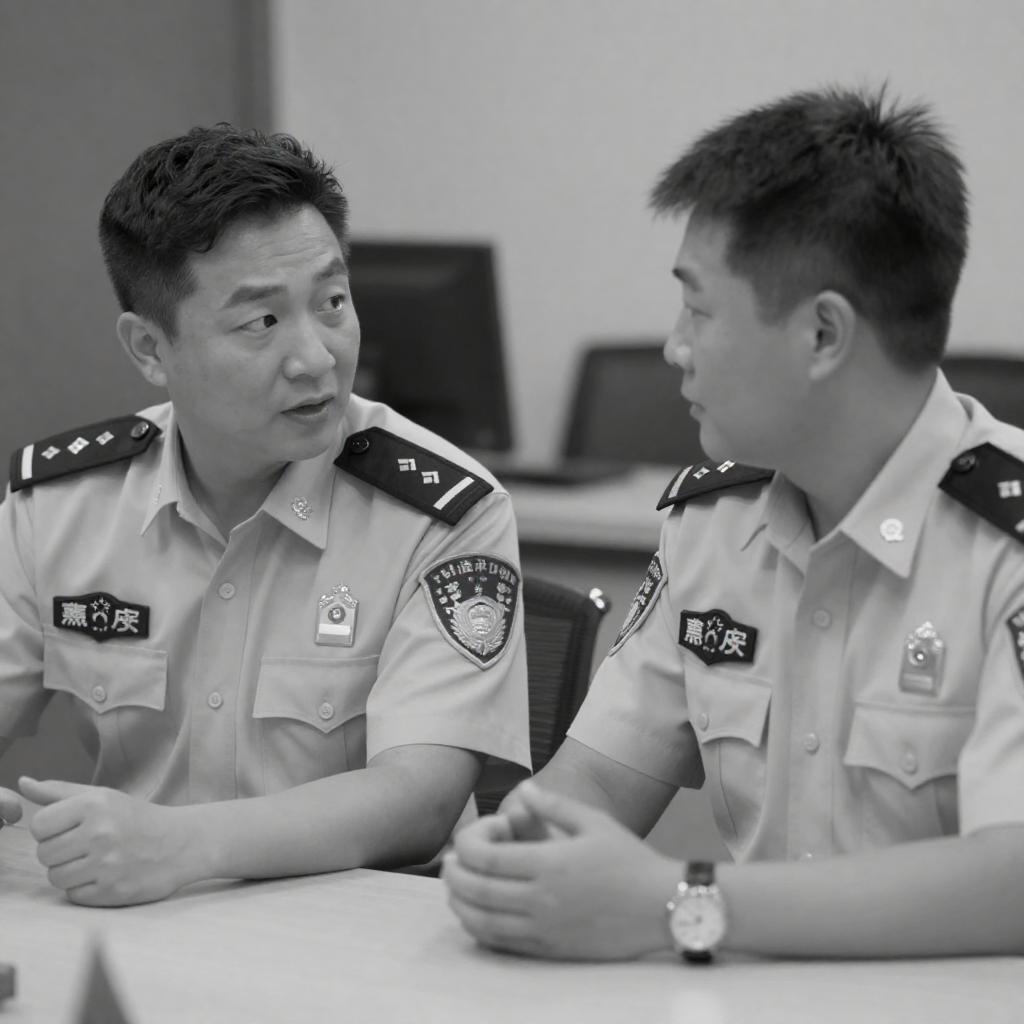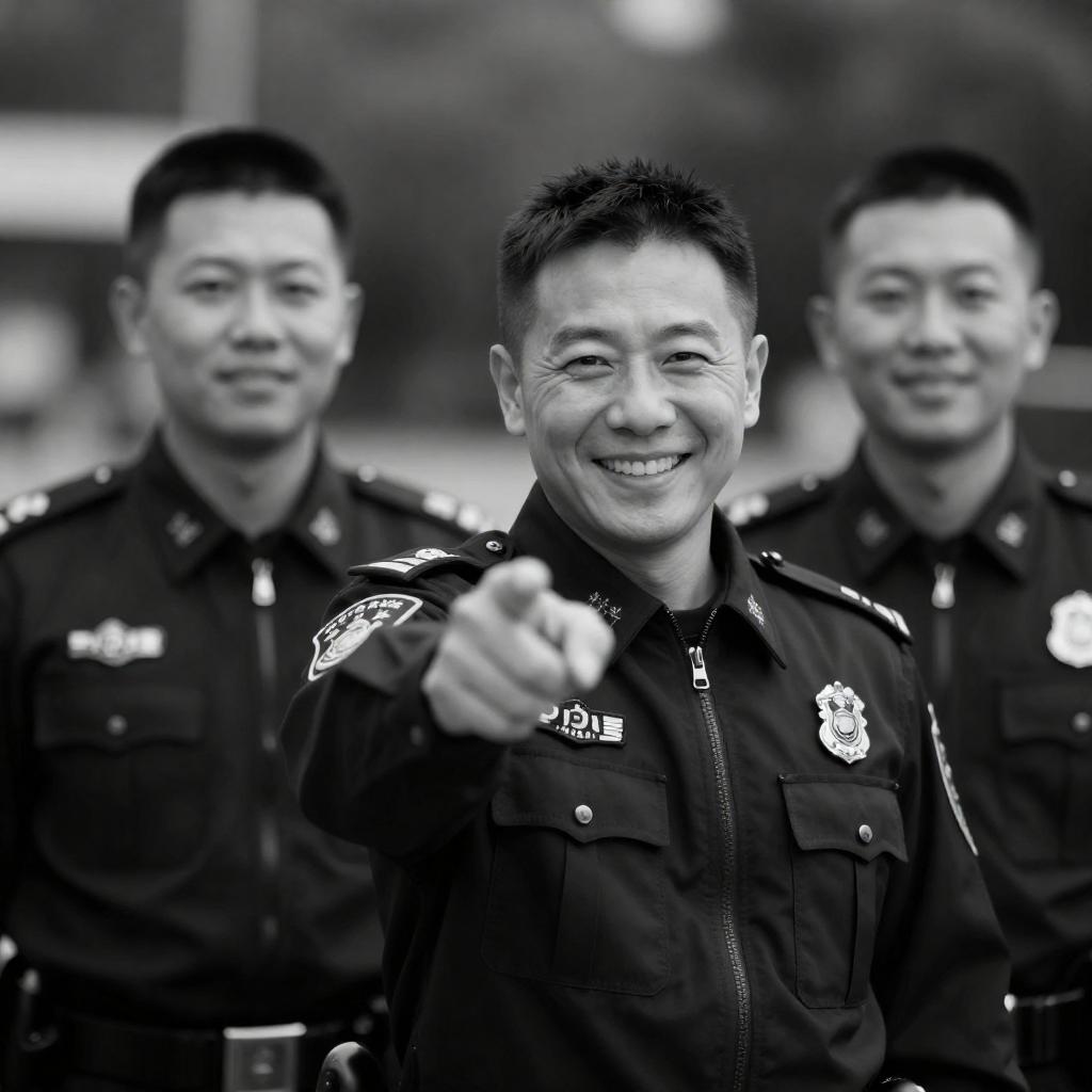 Black-and-white photograph of three smiling police officers in uniform, with the central officer prominently in focus, pointing forward. The background is blurred, emphasizing the officers' faces and expressions. The officers have short hair and wear dark jackets with badges. The image has a high-contrast, dramatic style.
