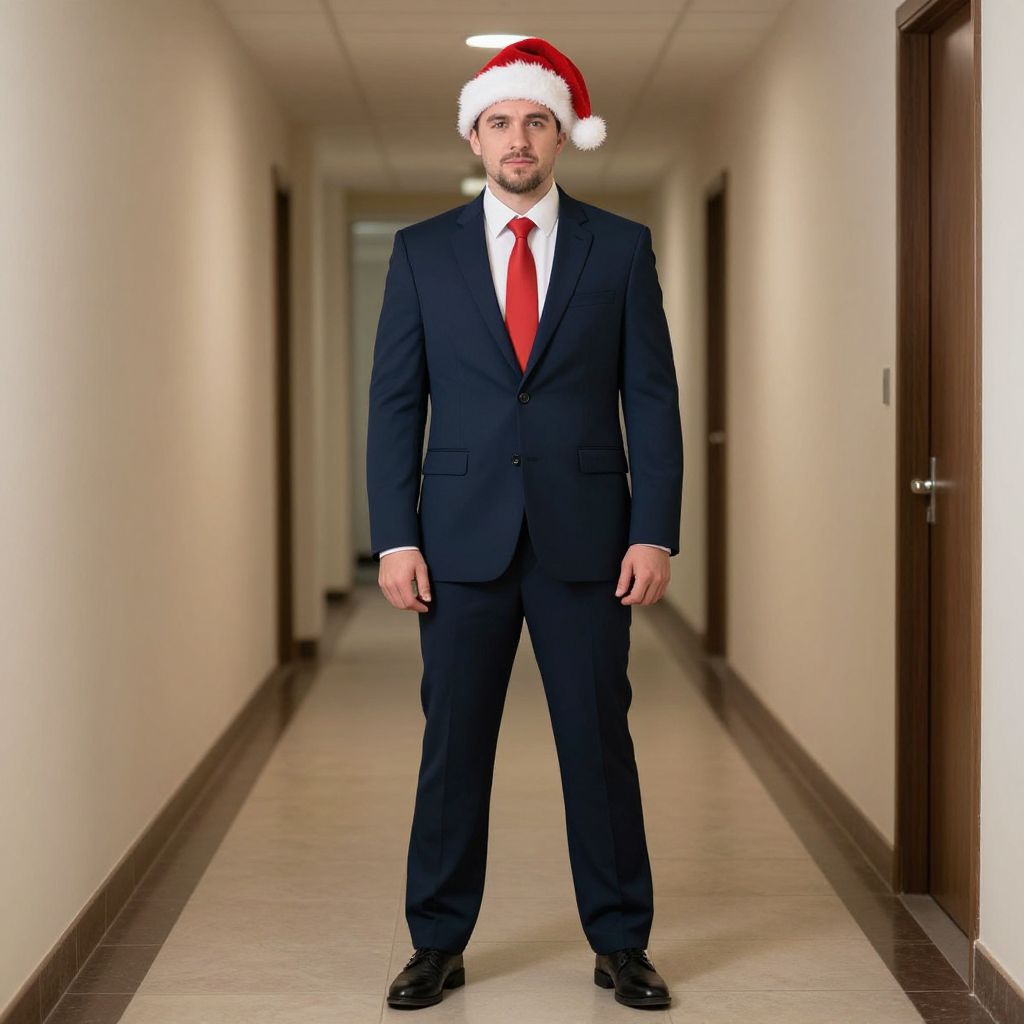 Santa Claus Business Suit Costume, dressed in a suit and santa claus hat standing in a hallway