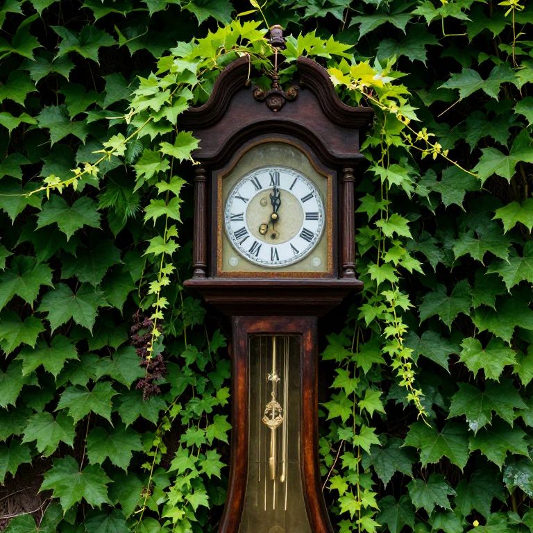Photograph of an antique, dark wooden grandfather clock with a white clock face featuring black Roman numerals and black clock hands. The clock is surrounded by dense, vibrant green ivy leaves, creating a lush, natural backdrop. Light filters through the leaves, casting dappled shadows on the clock's glass panes. The ivy vines wrap around the clock's top and sides, adding a sense of age and tranquility. The clock's design is ornate, with a curved top and decorative elements. The overall composition is rich in texture and color, highlighting the contrast between the dark wood and the bright green foliage.
