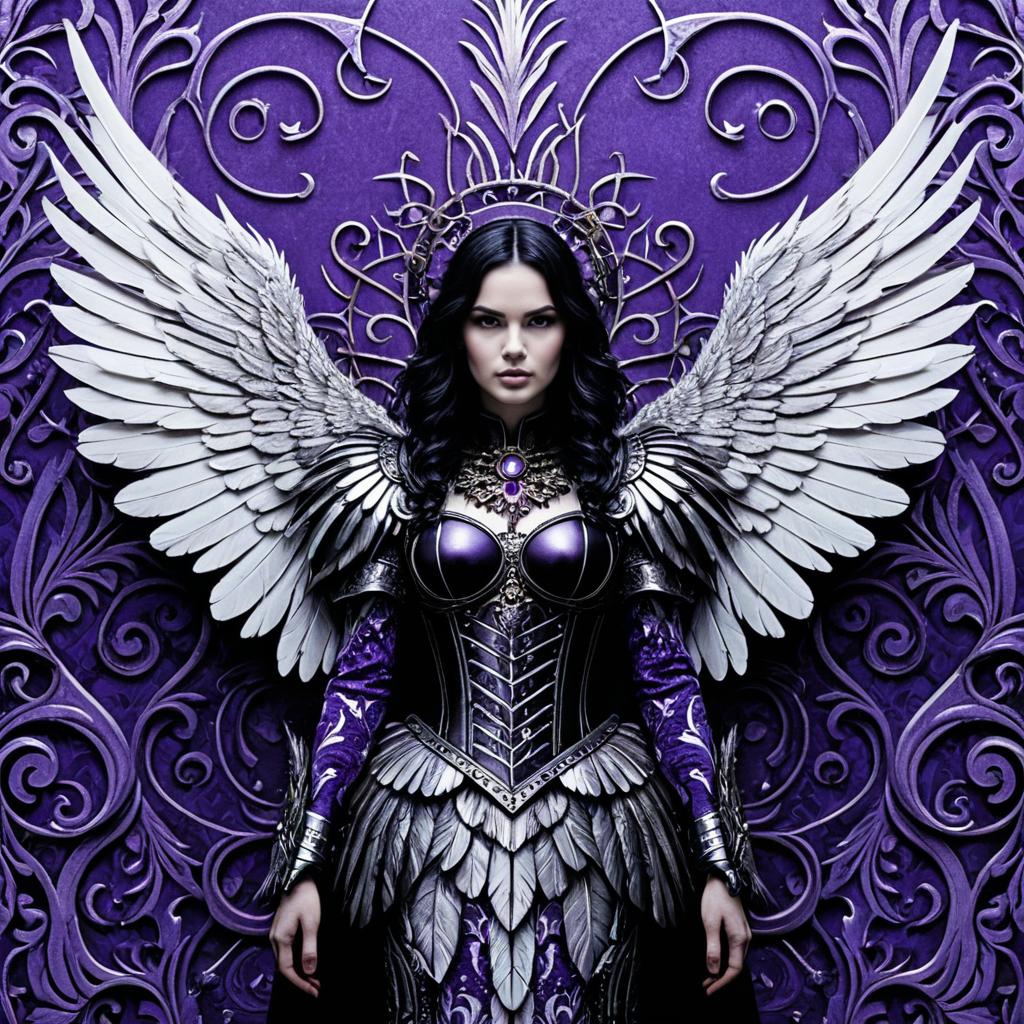 Gothic angel with intricate feather patterns and mechanical wings, set against a midnight purple and gold patterned background. The design showcases a mix of organic and mechanical elements, with the wings featuring both feathered and metallic details. Rendered in a style inspired by Mafalda Leon, Hajime Sorayama, the artwork highlights contrast and includes highly detailed, intricate patterns for a dramatic effect.