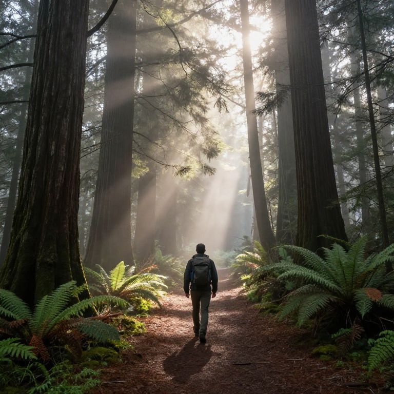 Walking tall through a misty forest path in early morning, rays of sunlight filtering through towering ancient trees, a lone adventurer carrying a backpack, serene atmosphere with soft light on ferns and moss, embodying resilience and calmness.