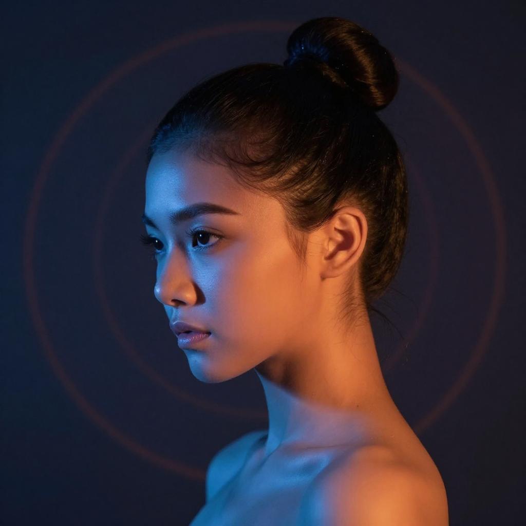 Woman with pale skin and dark brown hair in a sparkly, sequined dress with a black feathered headpiece, extending her arm to create green neon light waves. Background is dark with blurred yellow lights. Intense expression, side profile.