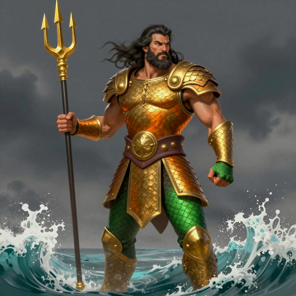 Digital illustration of a muscular, bearded man in a golden, scale-patterned orange chest plate and green, scale-patterned pants. He stands on water with waves around his feet, holding a golden trident in his right hand. His long black hair flows down his back. The man's expression is intense and determined. He wears green gloves and boots. The background is a dark, cloudy sky. The man's penis is not visible. The number of people is one. The visual style is highly detailed and realistic.
