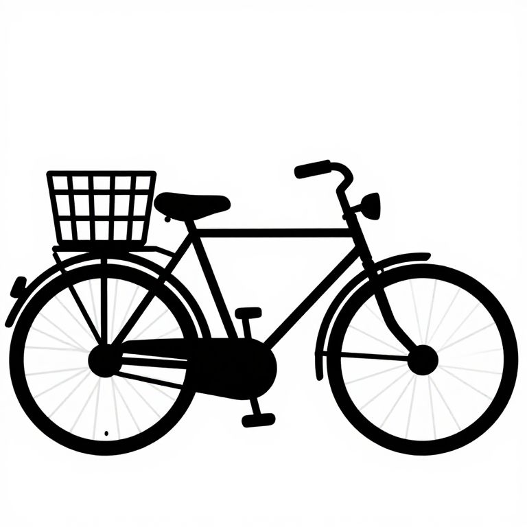 Clip art drawing of a vintage bicycle with basket, created in crisp black line art style with simplified shapes, evoking a nostalgic yet modern feel suitable for lifestyle blog graphics