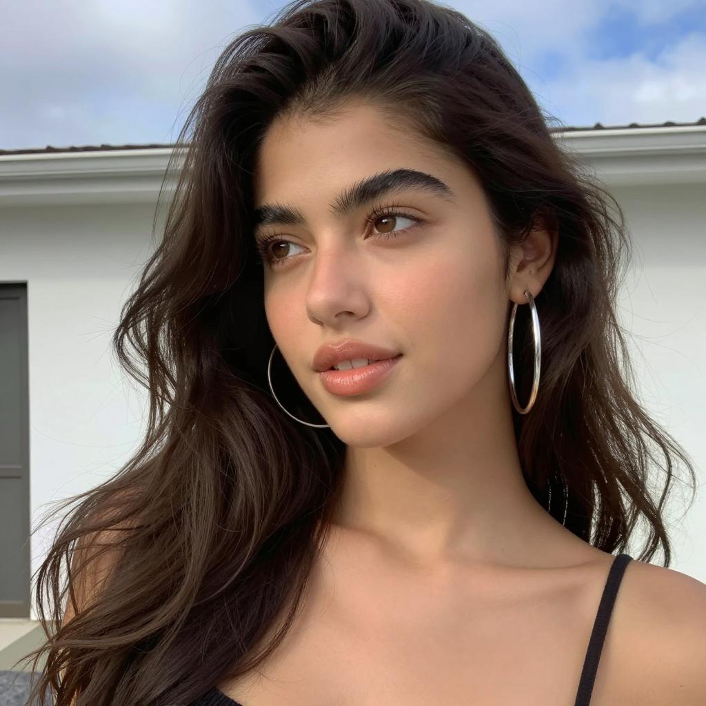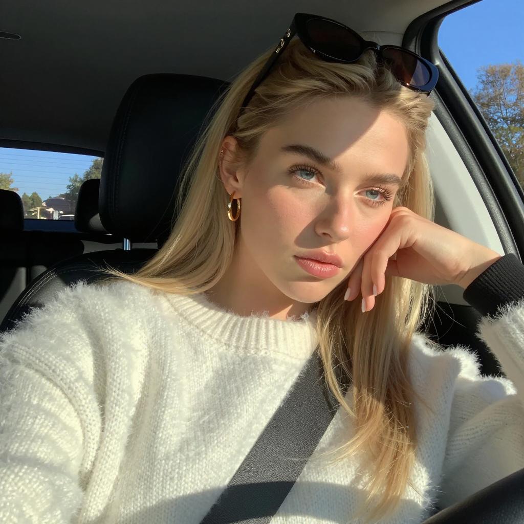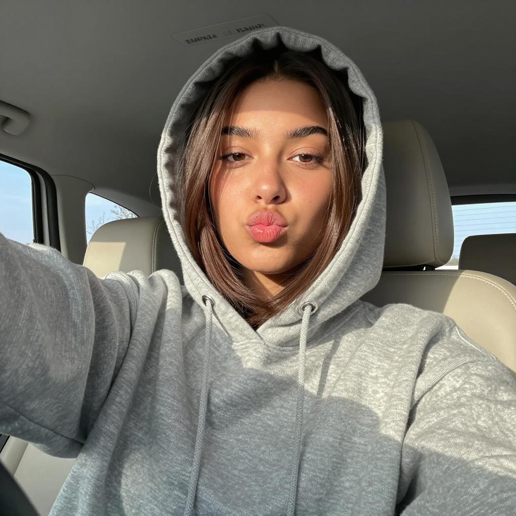 Young woman with light brown skin and straight brown hair, wearing a gray hooded sweatshirt with the hood up, pouting her lips. Sunlight shines on her face. She is inside a car with beige seats. Left arm extended for a selfie. Text "EMPIEZA EL VIAJE" on the car's ceiling.